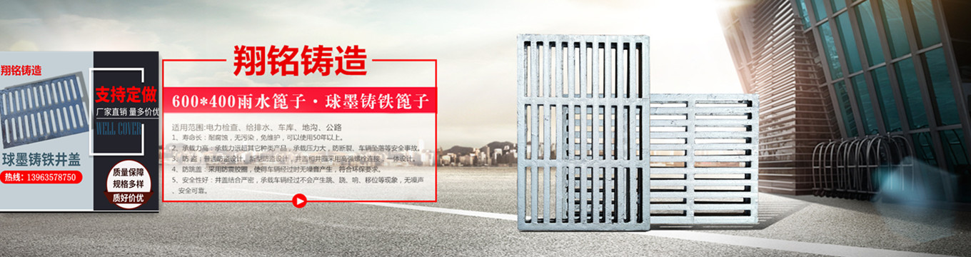 山東翔銘金屬制造有限公司擁有雄厚的技術力量,設備齊全,檢測手段完善,管理方法科學。隨著改革開放的不斷深入,市政建設正日新月異地飛速發展,本廠愿積極的態度為城市建設現代化做出應有的貢獻。球墨鑄鐵井蓋,雨水鑄鐵篦子,車庫篦子,排水溝蓋板,球墨鑄鐵篦子具有優良的耐腐性能,強度高,抗強壓,抗挫,抗拉,抗沖擊及承載能力強,防盜,安全等優點。使用說明經過國家化學建材質量監督檢驗中心及質量技術監督檢驗研究院的化學檢測,技術指標可長達50年之久,球墨鑄鐵井蓋是市政建設,城市綠化的選擇。多年來,本廠產品暢銷省內外,質量可靠,售后服務完善,深受廣大用戶的好評。